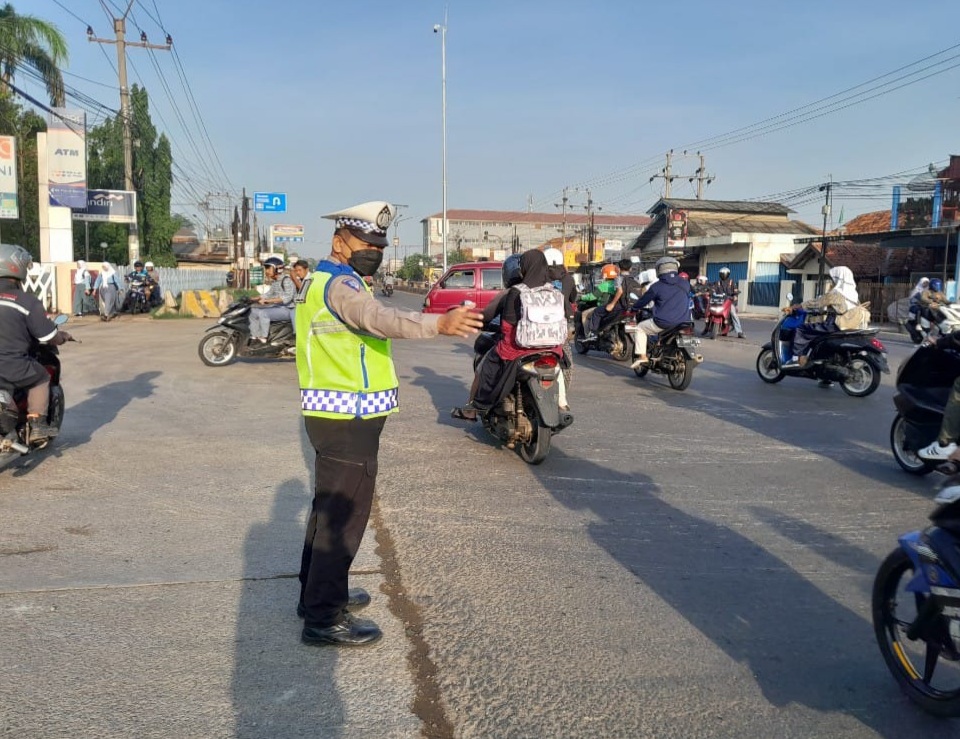 Berikan pelayanan prima kepada masyarakat dan cegah Lakalantas serta kemacetan , personil Unit Lantas Polsek Cikampek Gatur Lalin Pagi didepan Pupuk Kujang Cikampek, yang bertempat di