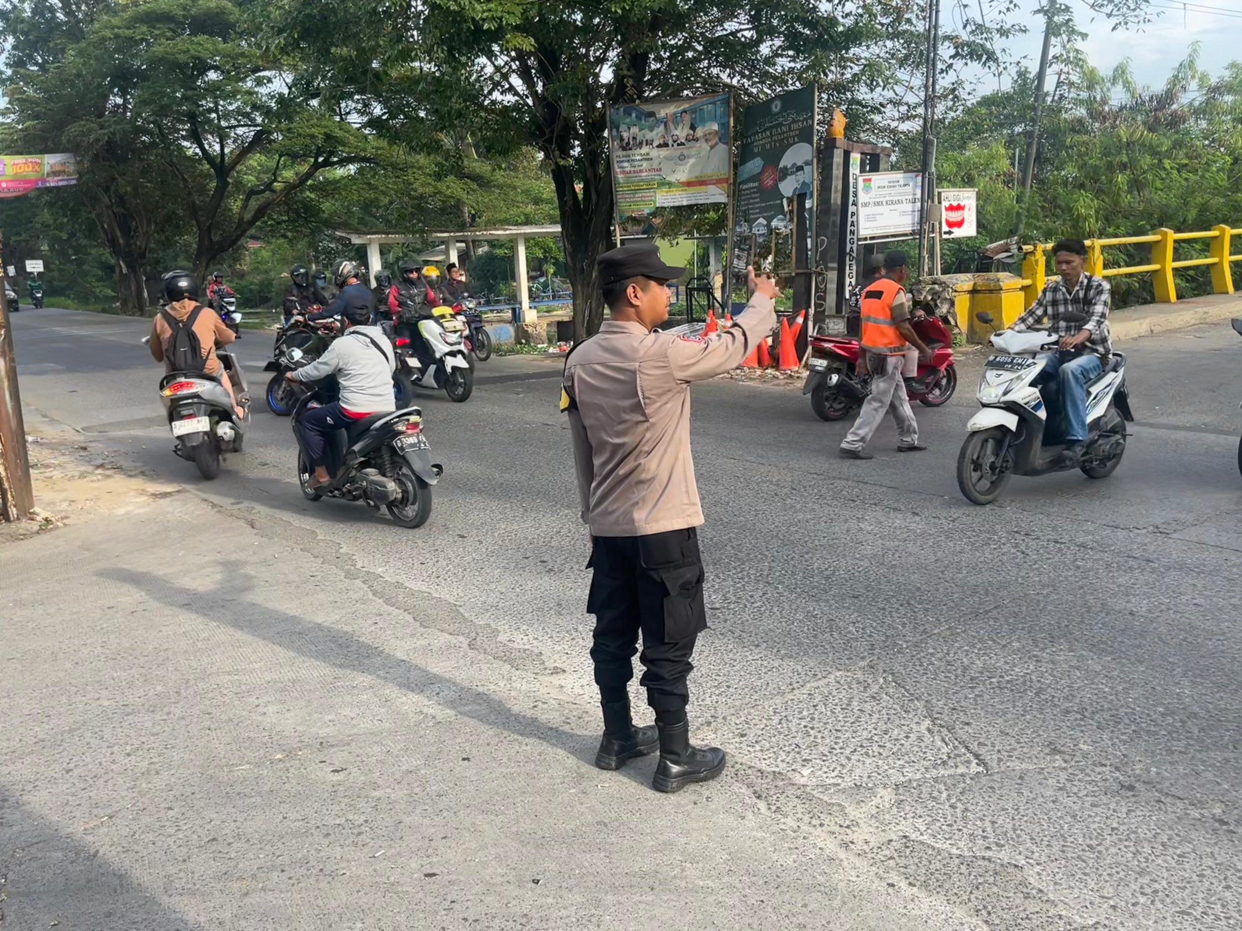 Selain melakukan pengaturan lalu lintas, anggota juga memberikan imbauan kepada para pengguna jalan agar selalu mematuhi peraturan lalu lintas, menggunakan helm bagi pengendara sepeda motor, serta mengutamakan keselamatan saat berkendara.
