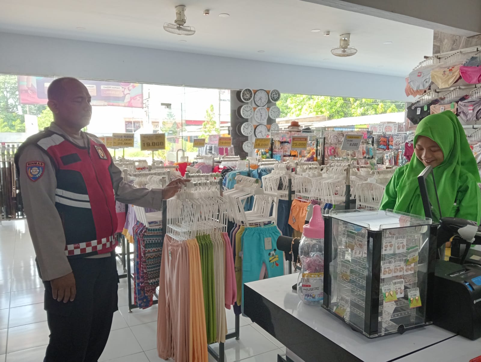 Aipda Naan, personil Polsek Telagasari Polres Karawang Polda Jabar, melakukan giat patroli ke salah satu pertokoan yang ada di Telagasari.