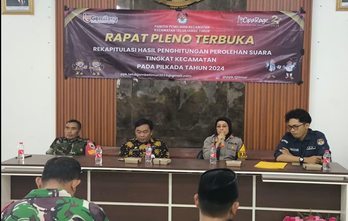Jurnalnasional.Net || Polres Karawang – Kapolsek Telukjambe Timur bersama Unsur Muspika menghadiri rapat pleno terbuka rekapitulasi penghitungan perolehan suara Tingkat Kecamatan Telukjambe Timur pada Pilkada 2024, Kamis (28/11/2024).
