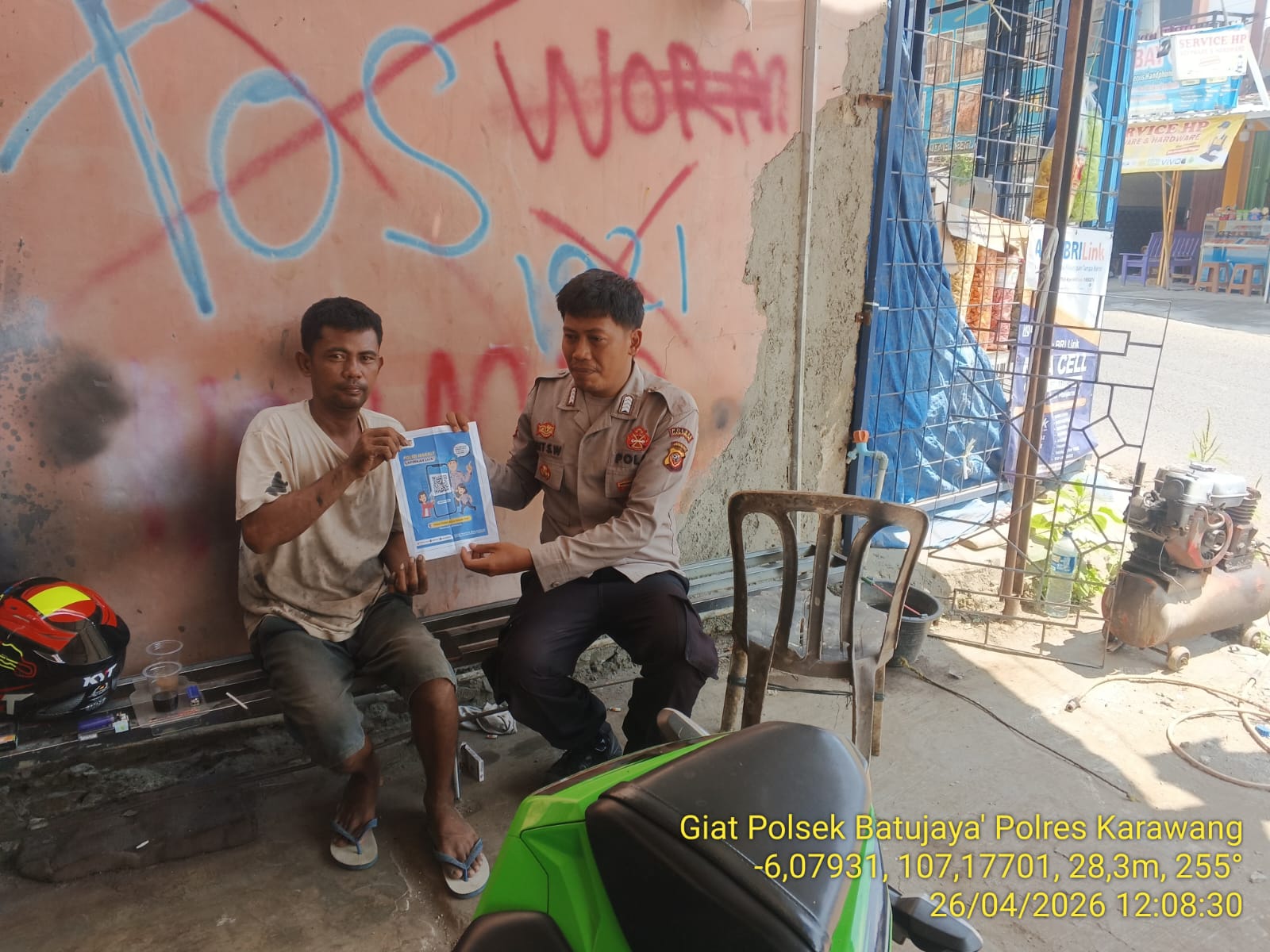 Jurnalnasional.Net || Polres Karawang – Polsek Batujaya Polres Karawang Polda Jabar, Anggota Polsek Batujaya Polres Karawang Polda Jabar Bripka Sigit Shinto Wibowo Sambangi Masyarakat Desa Batujaya guna mengajak untuk menjaga Keamanan dan Ketertiban serta Kondusifitas di lingkungan masyarakat khususnya di Wilayah Hukum Polsek Batujaya serta mensosialisasikan QR Code Div Propam Polri. Minggu (26/4/2026)
