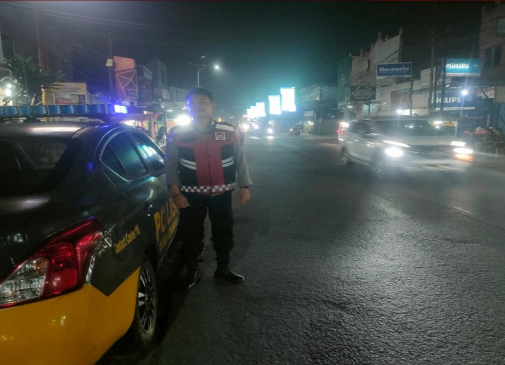 Patroli Malam Sasar Jalur Jalan A Yani strong point di Lapmer Dawuan Cikampek Cegah C3 sekaligus pantau pertokoan yang ada di sekitarnya .