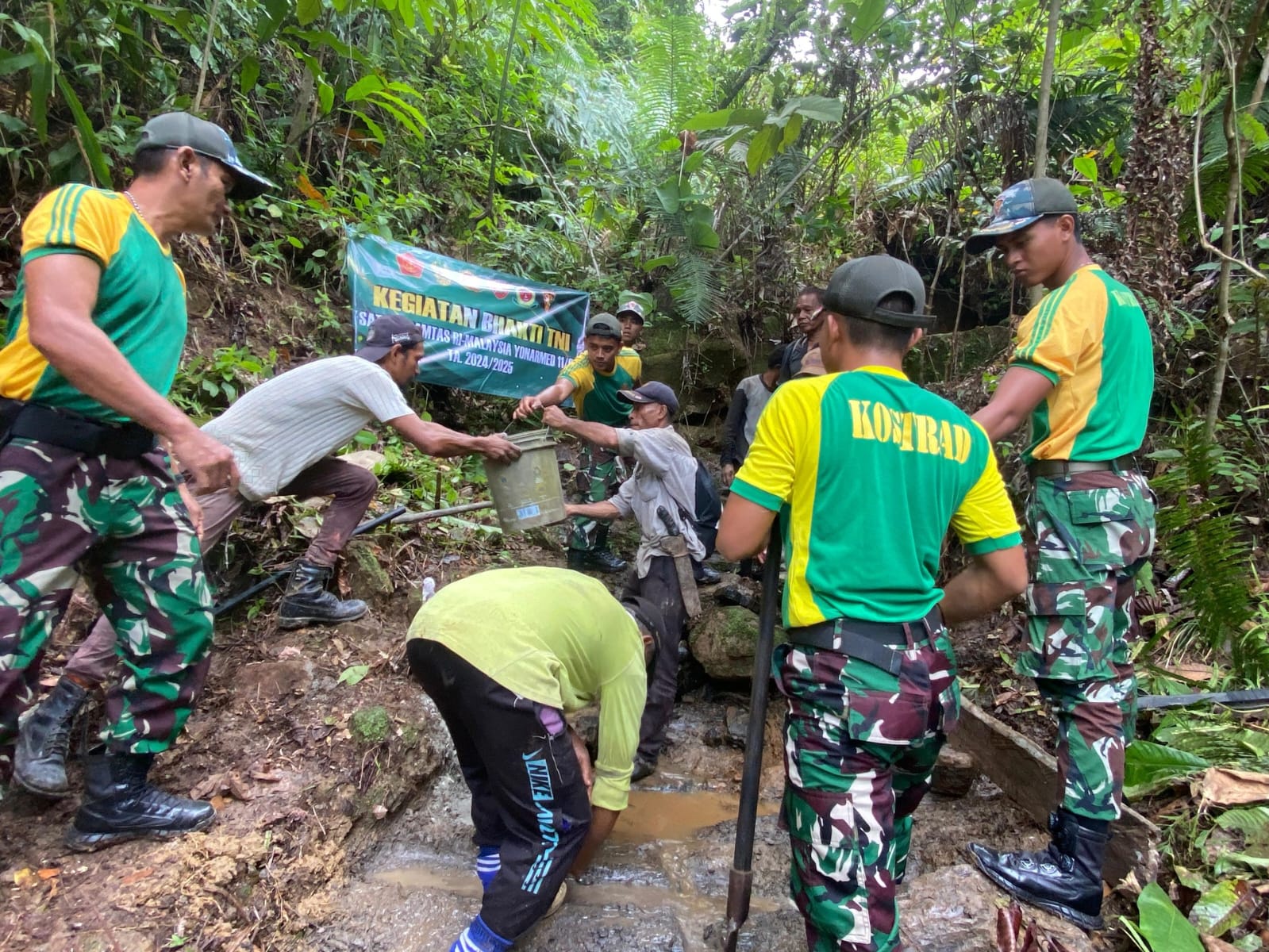Jurnalnasional.Net || Nunukan – Satgas Pamtas Yonarmed 11 Kostrad Pos Bukit Keramat bekerja sama dengan masyarakat Kampung Bukit Keramat, Desa Bambangan, Kecamatan Sebatik Barat, Kabupaten Nunukan, membangun saluran mata air untuk membantu memenuhi kebutuhan air bersih warga. Program ini diharapkan dapat mempererat hubungan antara Satgas dan masyarakat setempat, serta meningkatkan kualitas hidup warga di wilayah perbatasan. Sabtu (22/2/2024).