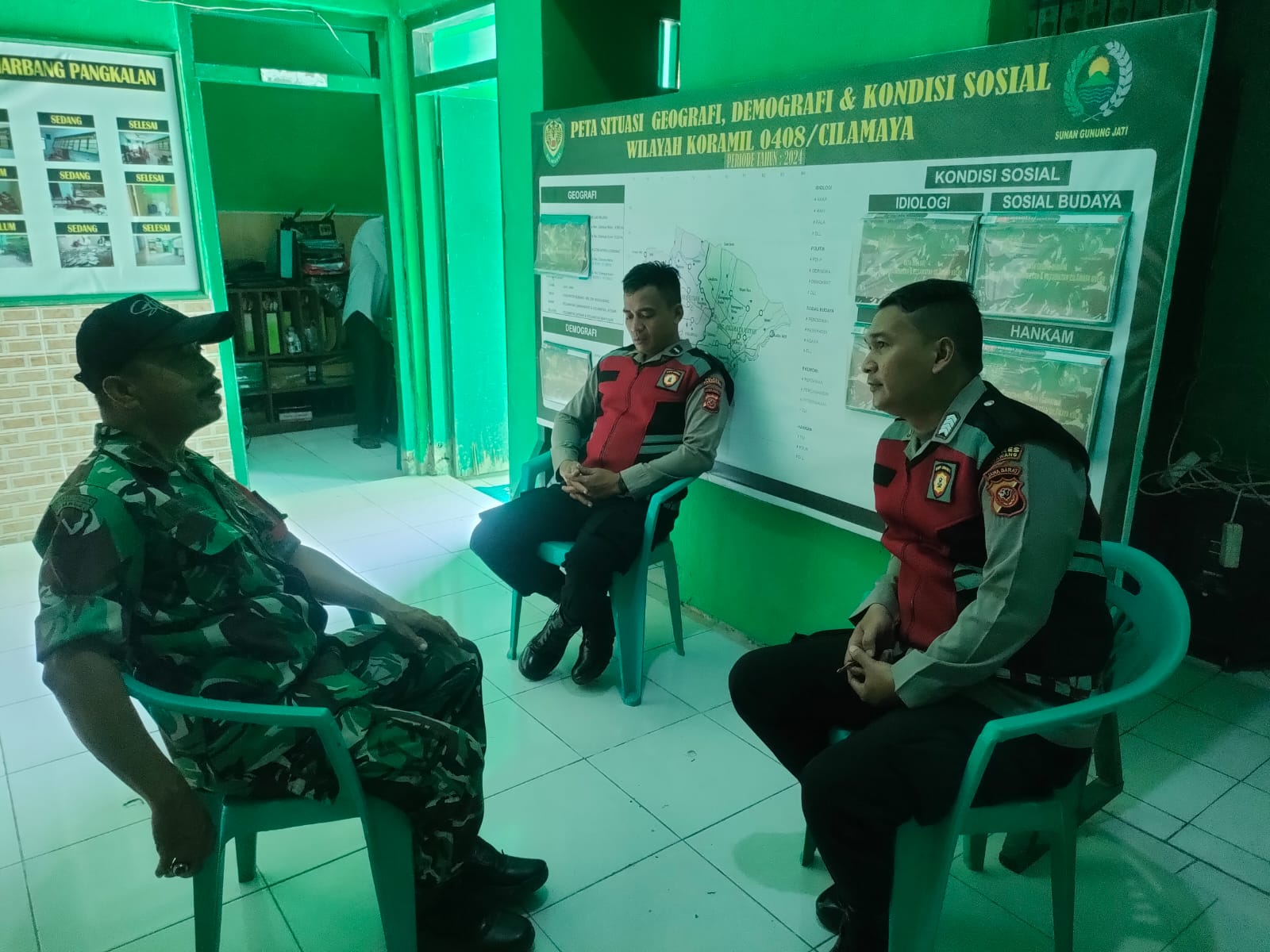 Kegiatan Patroli Polsek Cilamaya melaksanakan Sambang kepada anggota Piket Koramil Cilamaya 0408 Kecamatan Cilamaya Wetan Kabupaten Karawang , dilaksanakan oleh Aipda Lino dan Bripka Yudha .