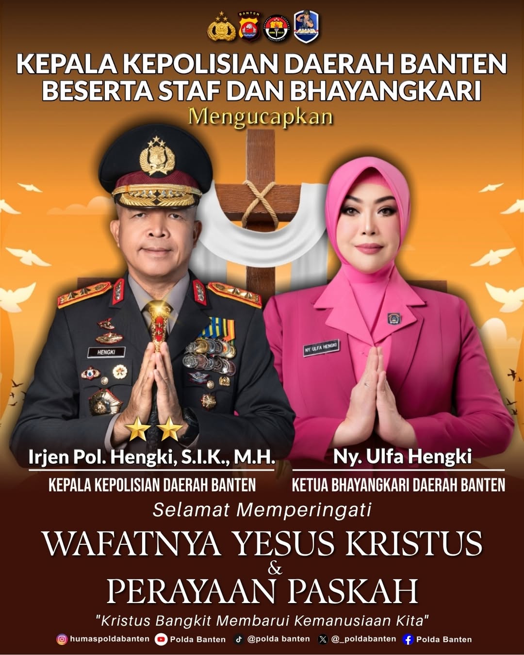 Dalam kesempatannya, Kapolda Banten Irjen Pol Hengki menyampaikan ucapan selamat memperingati Jumat Agung kepada seluruh umat Kristiani yang merayakan. “Polda Banten beserta staf dan Bhayangkari mengucapkan selamat memperingati Jumat Agung kepada seluruh umat Kristiani. Semoga damai dan kasih senantiasa menyertai kita semua serta membawa pembaruan dalam kehidupan kemanusiaan yang lebih baik,” ujarnya pada Jumat (03/04).