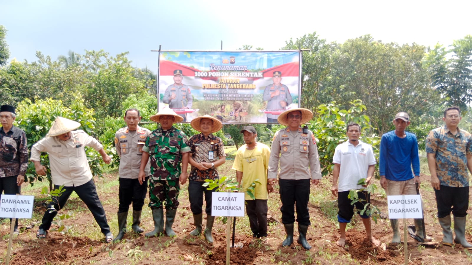 Selanjutnya pada pukul 11.50 WIB, kegiatan dilanjutkan dengan penanaman pohon secara simbolis di lokasi oleh Kapolsek Tigaraksa, Danramil, dan Camat Tigaraksa beserta jajaran. Setelah itu, kegiatan penanaman diteruskan oleh kelompok tani dengan jumlah sekitar 100 pohon yang ditanam di area Eduwisata Desa Sodong.