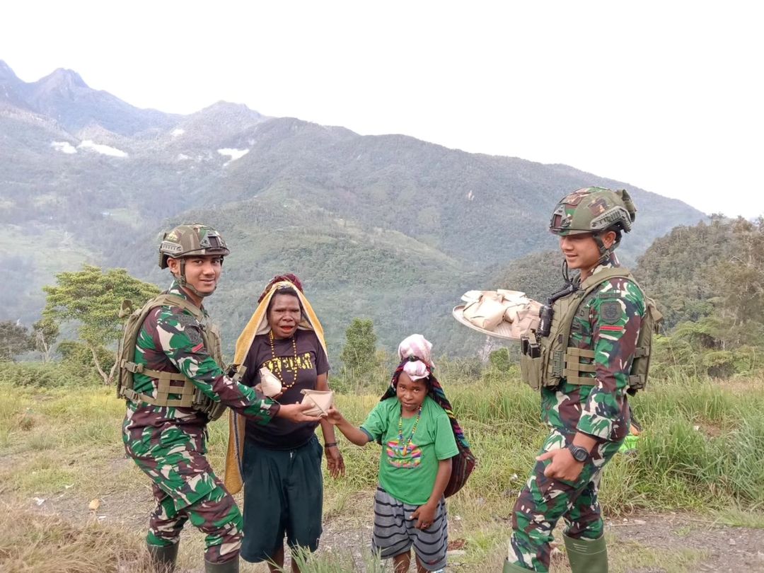 Jurnalnasional.Net || Satgas Mobile Yonif 323/Buaya Putih yang bertugas di wilayah pedalaman Papua Tengah melaksanakan kegiatan Jum’at Berkah dengan berbagi makanan di Kampung Wombru, Distrik Megeabume, Kabupaten Puncak, Papua Tengah, pada Sabtu (09/11/2024).